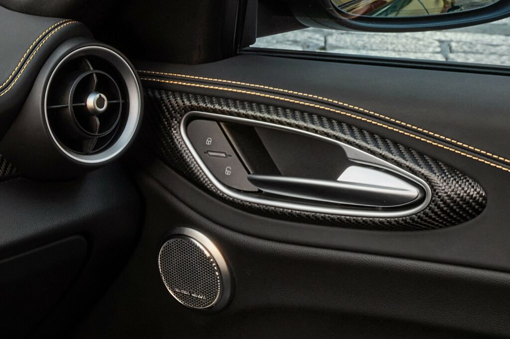 - Détails extérieurs : Les logos Quadrifoglio sur les ailes sont cerclés d’or, et les étriers de frein arborent une peinture dorée spécifique.