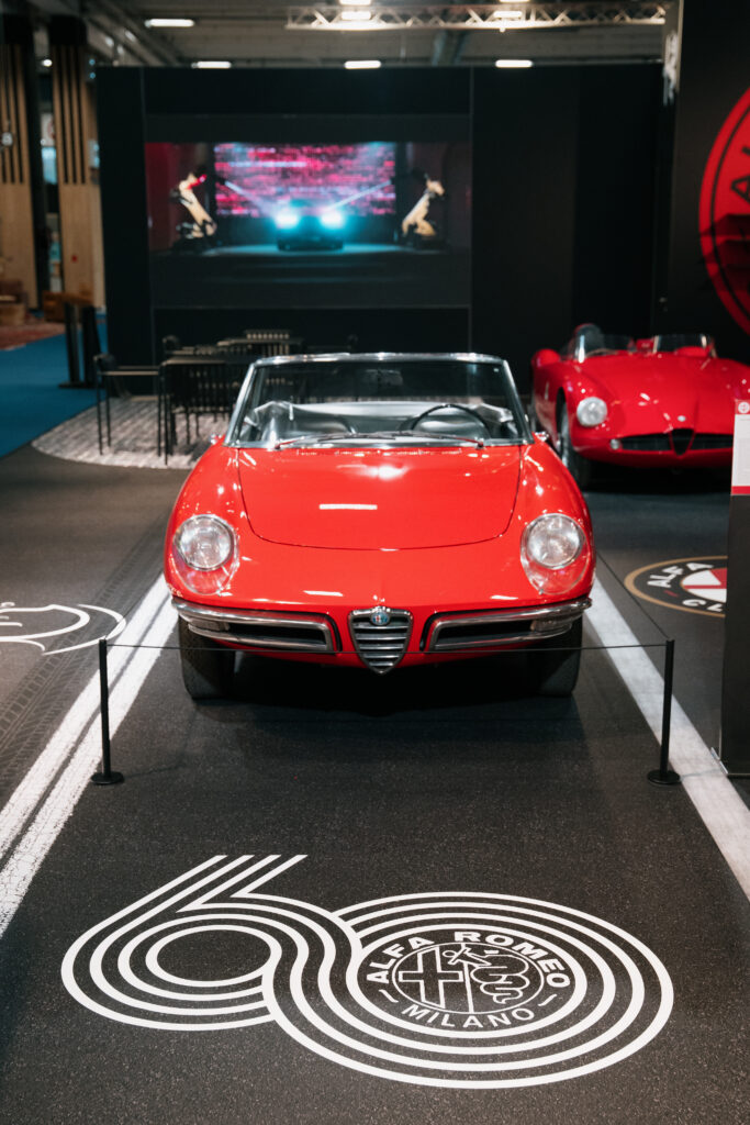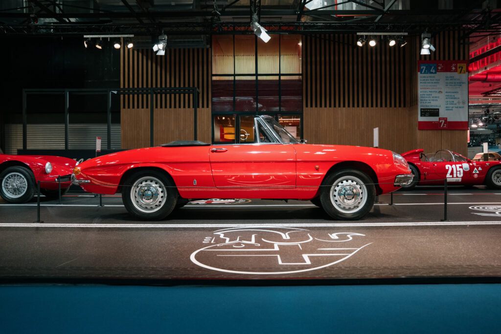 - Alfa Romeo 1600 Spider « Duetto » (1966) : Cette année marque le 60e anniversaire de ce chef-d’œuvre. Dessiné par Pininfarina pour succéder à la Giulietta Spider, le Duetto est célèbre pour sa forme en « os de seiche » et son rôle mythique dans le film Le Lauréat avec Dustin Hoffman. L’exemplaire exposé provient du Musée Historique d’Arese.