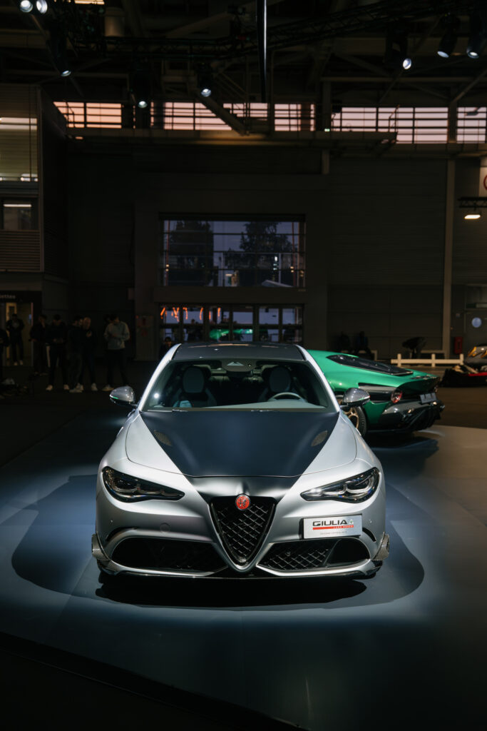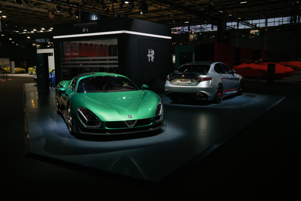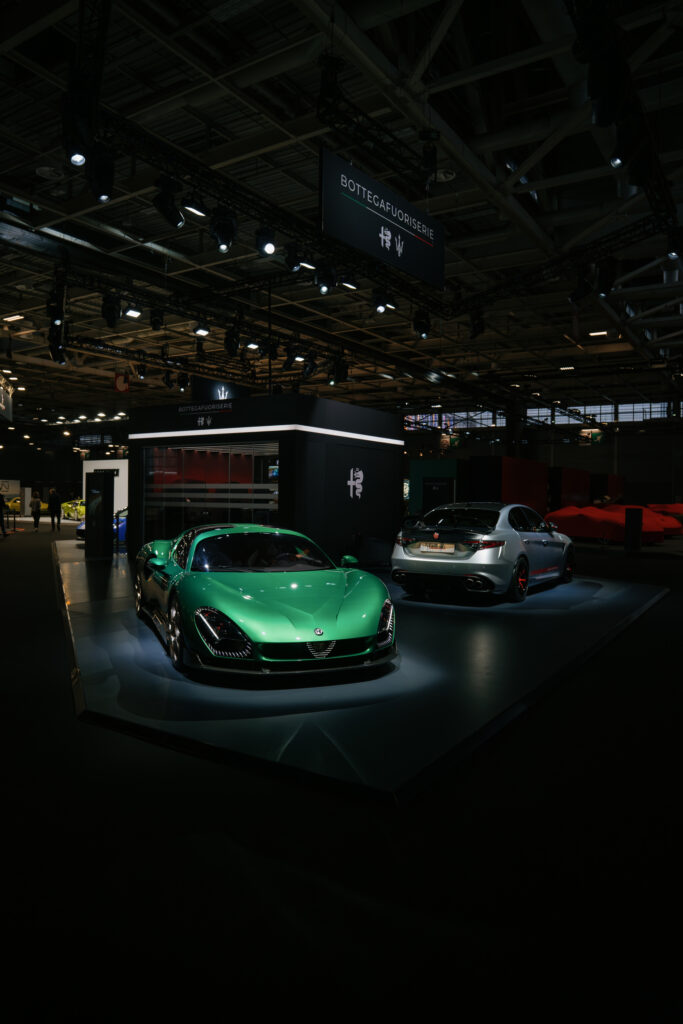 Sur le stand, Alfa Romeo attire tous les regards avec deux créations qui incarnent parfaitement les piliers de ce nouveau département : l’exclusivité « Bottega » et la personnalisation « Fuoriserie ».