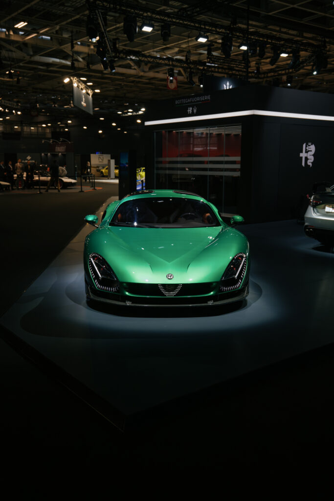- Alfa Romeo 33 Stradale : L’icône moderne est présente dans une configuration inédite. Le modèle exposé arbore une livrée verte spectaculaire, un clin d’œil direct aux références historiques de la marque comme la 33 Bertone Carabo ou les mythiques GTA et GTAm. Limitée à 33 exemplaires (tous vendus), elle associe son design sculptural au V6 biturbo de 630 chevaux.